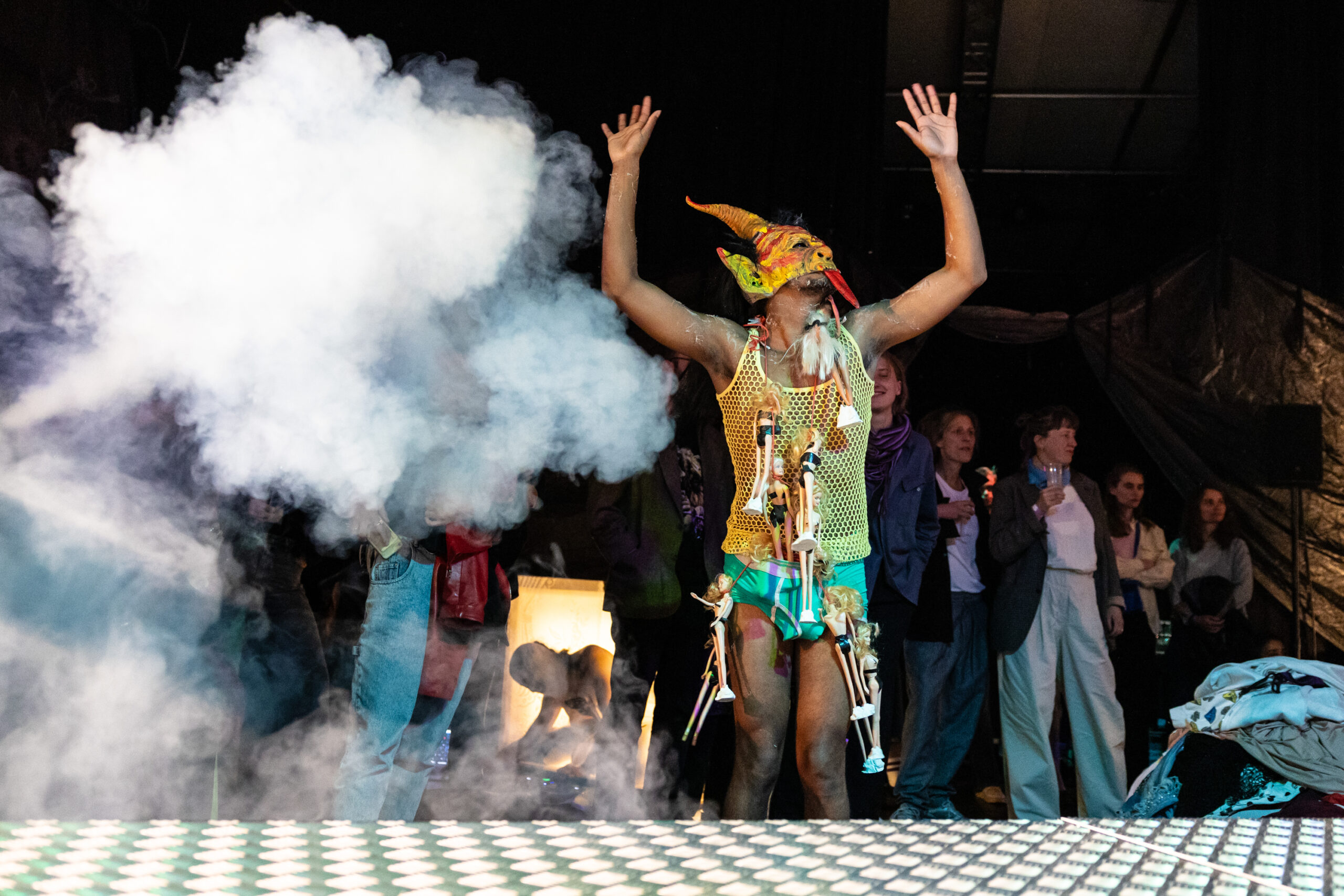 HOLOBIONT is geen voorstelling, maar een viering. In een donkere bar-dancing in het midden van Terschelling brengen we een ode aan het niet-af-zijn. In deze vier uur durende happening nodigen queer performers het publiek uit in een zintuiglijk landschap van lichamen die zich verzetten tegen binaire categorieën. Een anarchistische dansvloer. Geen stoelen, geen tribune. Dansen mag, maar in een hoekje zitten met een biertje mag ook. Een feestelijke ontmoeting vol uitbundige opsmuk, veren, pruiken, boormachines en verlegen liedjes.